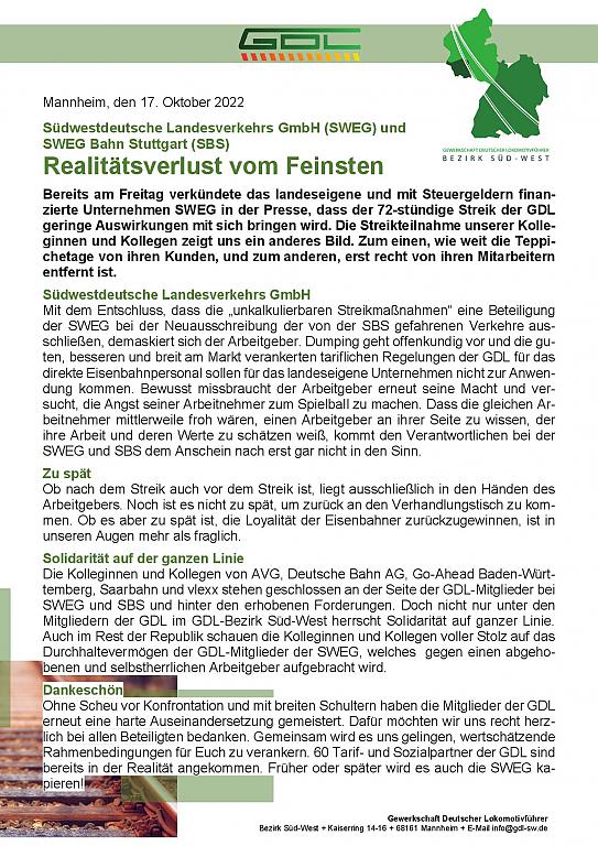 Ohne Scheu vor Konfrontation und mit breiten Schultern haben die Mitglieder der GDL erneut eine harte Auseinandersetzung gemeistert. Dafür möchten wir uns recht herzlich bei allen Beteiligten bedanken. Gemeinsam wird es uns gelingen, wertschätzende Rahmenbedingungen für Euch zu verankern. 60 Tarif- und Sozialpartner der GDL sind bereits in der Realität angekommen. Früher oder später wird es auch die SWEG kapieren!