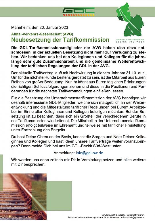 Für die Besetzung der Unternehmenstarifkommission der AVG benötigen wir deshalb interessierte GDL-Mitglieder, welche sich maßgeblich an der Weiterentwicklung und die Mitgestaltung tariflicher Regelungen bei Eurem Arbeitgeber im Sinne aller Kolleginnen und Kollegen beteiligen möchten. Bei der Besetzung ist zu beachten, dass sich ein Großteil der verschiedenen Berufe in der Tarifkommission wiederfindet. Die Mitarbeit in der Unternehmenstarifkommission erfolgt teilweise im Ehrenamt und teilweise mit tariflicher Freistellung unter Fortzahlung des Entgelts.