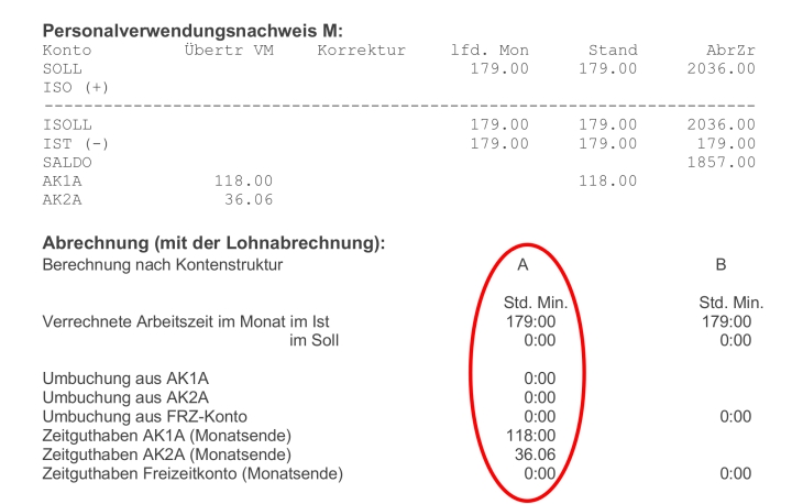 Aus dem Übergangskonto fließen jährlich bis zu 38 h ins Ausgleichskonto bis es leer ist. Alle Überstunden kommen am Ende des Abrechnungszeitraums in das Ausgleichskonto.