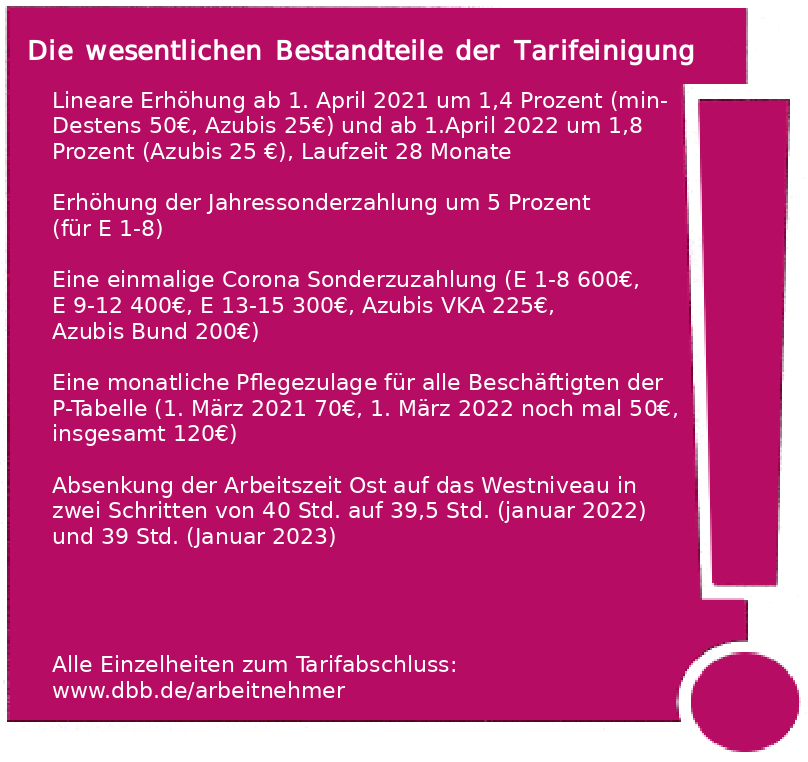 Über zwei Verhandlungsrunden hinweg hätten die Arbeitgeber ein Tarifangebot verweigert. „Nachdem sie diese Position aufgegeben hatten, haben wir in der dritten Runde Schritt für Schritt und Thema für Thema einen Kompromiss erzielt, der in die Zeit passt", so Geyer weiter. Das Ergebnis erkenne Geleistetes an, helfe vor allem im Gesundheitsbereich, den öffentlichen Dienst zukunftsfest zu machen, und ignoriere auch nicht, „dass die Pandemie die wirtschaftlichen Möglichkeiten in unserem Land aktuell nachhaltig beeinflusst. Es zeichnet diesen Kompromiss aus, dass er gesellschaftliche Notwendigkeiten mit den berechtigten Interessen der öffentlich Beschäftigten in Einklang gebracht hat." Das habe die Bundestarifkommission (BTK) des dbb, die — anders als üblich — nicht vor Ort in Potsdam tagte, sondern pandemiebedingt virtuell zugeschaltet war, ebenfalls so bewertet und dem Abschluss mit großer Mehrheit zugestimmt.