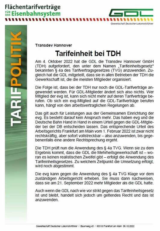Die Folge ist, dass bei der TDH nur noch die GDL-Tarifverträge angewendet werden. Für GDL-Mitglieder ändert sich also nichts. Wer