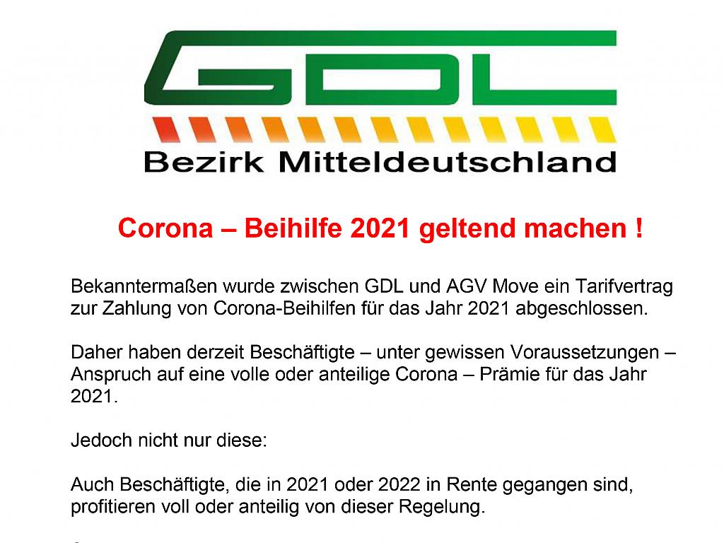 Bekanntermaßen wurde zwischen GDL und AGV Move ein Tarifvertrag zur Zahlung von Corona-Beihilfen für das Jahr 2021 abgeschlossen. Daher haben derzeit Beschäftigte – unter gewissen Voraussetzungen – Anspruch auf eine volle oder anteilige Corona – Prämie für das Jahr 2021.