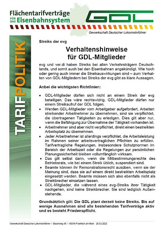 evg und ver.di haben Streiks bei allen Verkehrsträgern Deutschlands, und somit auch bei den Eisenbahnen angekündigt. Wie hoch oder gering auch immer die Streikauswirkungen sind – zum Verhalten von GDL-Mitgliedern bei Streiks der evg gibt es klare Aussagen, die dem Aushang zu entnehmen sind.