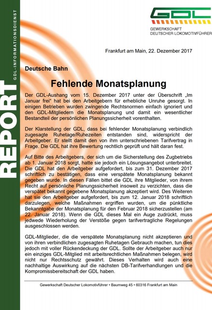 Auf Bitte des Arbeitgebers, der sich um die Sicherstellung des Zugbetriebs ab 1. Januar 2018 sorgt, hatte sie jedoch ein Lösungsangebot unterbreitet. Die GDL hat den Arbeitgeber aufgefordert, bis zum 31. Dezember 2017 schriftlich zu bestätigen, dass eine verspätete Monatsplanung bekannt gegeben wurde. In diesen Fällen bittet die GDL ihre Mitglieder, von ihrem Recht auf persönliche Planungssicherheit insoweit zu verzichten, dass die verspätet bekannt gegebene Monatsplanung akzeptiert wird. Des Weiteren hat sie den Arbeitgeber aufgefordert, bis zum 12. Januar 2018 schriftlich darzulegen, welche Maßnahmen ergriffen wurden, um die pünktliche Bekanntgabe der Monatsplanung für den Februar 2018 sicherzustellen (am 22. Januar 2018). Wenn die GDL dieses Mal ein Auge zudrückt, muss jedwede Wiederholung der Verstöße gegen tarifvertragliche Regelungen ausgeschlossen werden.