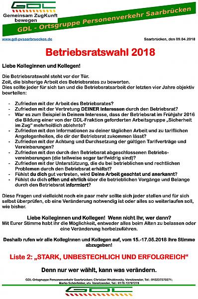 - War es zum Beispiel in Deinem Interesse, dass der Betriebsrat im Frühjahr 2016 die Bildung einer von der GDL-Fraktion geforderten Arbeitsgruppe "Sicherheit im Zug" mehrheitlich ablehnte?