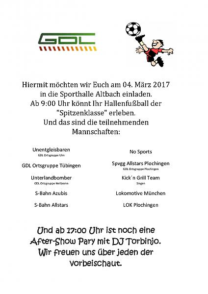 Hiermit möchten wir Euch am 04. März 2017 in die Sporthalle Altbach einladen. Ab 9:00 Uhr könnt Ihr Hallenfußball der "Spitzenklasse" erleben. Und das sind die teilnehmenden Mannschaften: