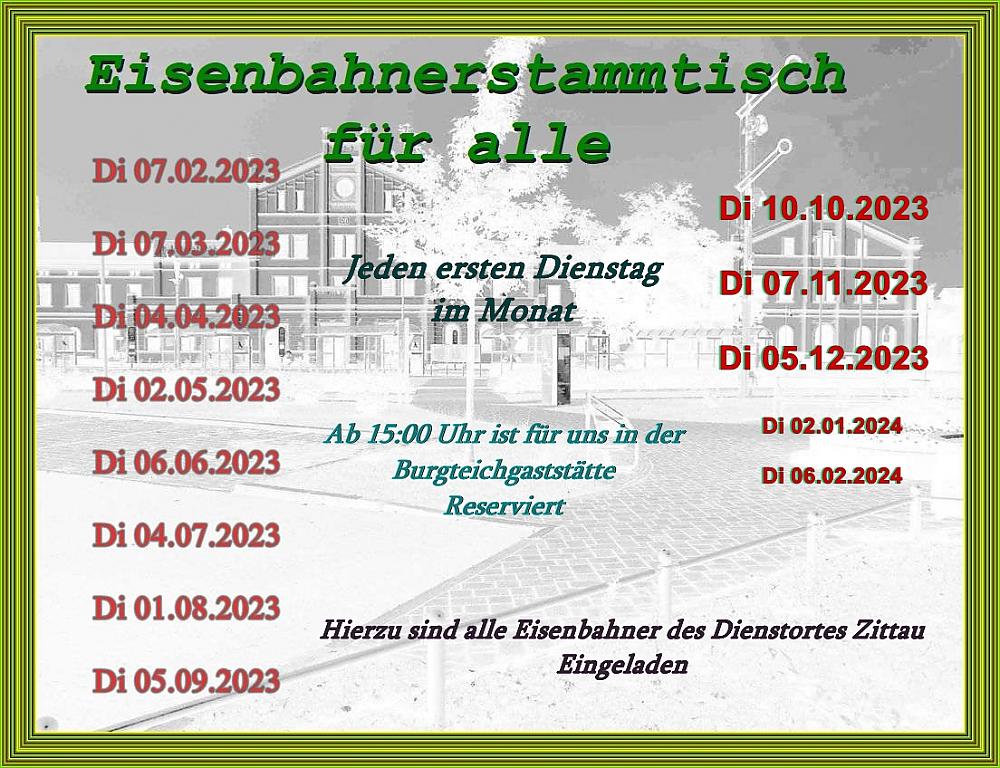 | Di 04.04.2023 | ab 15:00 Uhr | Eisenbahnerstammtisch | Gaststätte Burgteich |