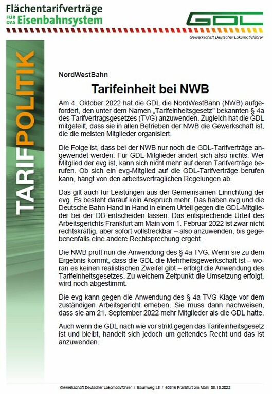 Die Folge ist, dass bei der NWB nur noch die GDL-Tarifverträge angewendet werden. Für GDL-Mitglieder ändert sich also nichts. Wer