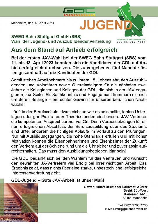Die GDL bedankt sich bei den Wählern für das Vertrauen und wünscht den gewählten JA-Vertretern viel Erfolg bei ihrer wichtigen Arbeit. Das Ergebnis zeigt, dass nichts über eine starke, unbestechliche, erfolgreiche Interessenvertretung geht.