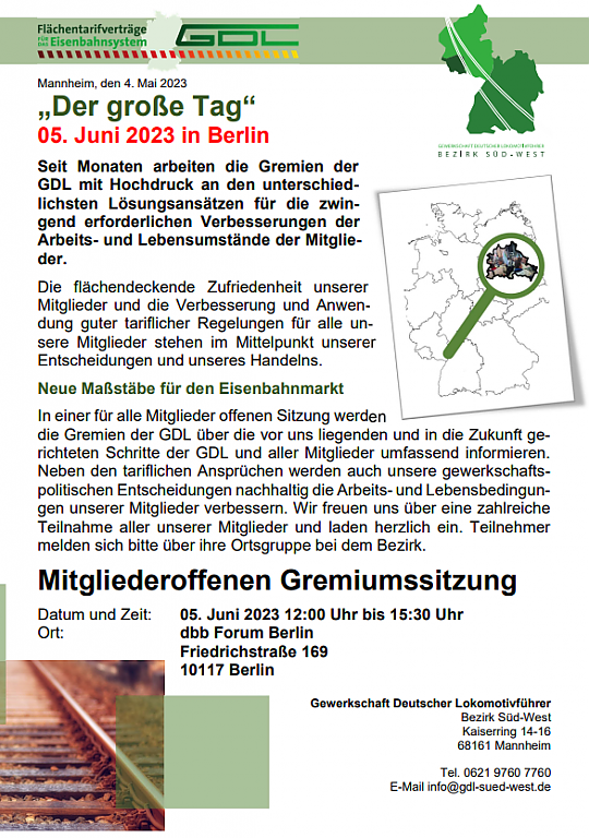 In einer für alle Mitglieder offenen Sitzung werden die Gremien der GDL über die vor uns liegenden und in die Zukunft gerichteten Schritte der GDL und aller Mitglieder umfassend informieren. Neben den tariflichen Ansprüchen werden auch unsere gewerkschaftspolitischen Entscheidungen nachhaltig die Arbeits- und Lebensbedingungen unserer Mitglieder verbessern. Wir freuen uns über eine zahlreiche Teilnahme aller unserer Mitglieder und laden herzlich ein.