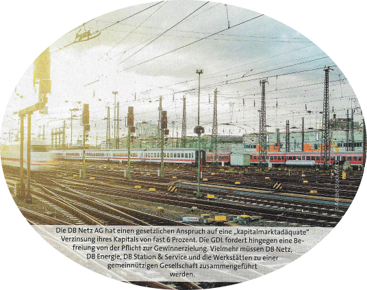 Die GDL fordert außerdem schon lange eine zweite Bahnreform. Das Herzstück dazu ist die Zusammenführung von DB Netz, DB Energie, DB Station & Service und den Werkstätten zu einer gemeinsamen Gesellschaft in einer geeigneteren Rechtsform, wie zum Beispiel als GmbH. DB Netz hat nämlich bis heute einen gesetzlichen Anspruch auf eine „kapitalmarktadäquate" Verzinsung ihres Kapitals von fast 6 Prozent! In einer anderen Gesellschaftsform könnten die Einnahmen aus den Trassenpreisen und Stationsentgelten sowie die Mittel des Bundes transparent und ohne Profitzwang in die Infrastruktur investiert werden. Ein Verschieben in die Transportgesellschaften oder in andere abenteuerliche Beteiligungen am Ende der Welt wäre damit nicht mehr möglich. Somit könnten auch Trassenpreise und die Anlagennutzungsentgelte günstiger werden, was gerade die Wettbewerbsposition zur Straße verbessert.
