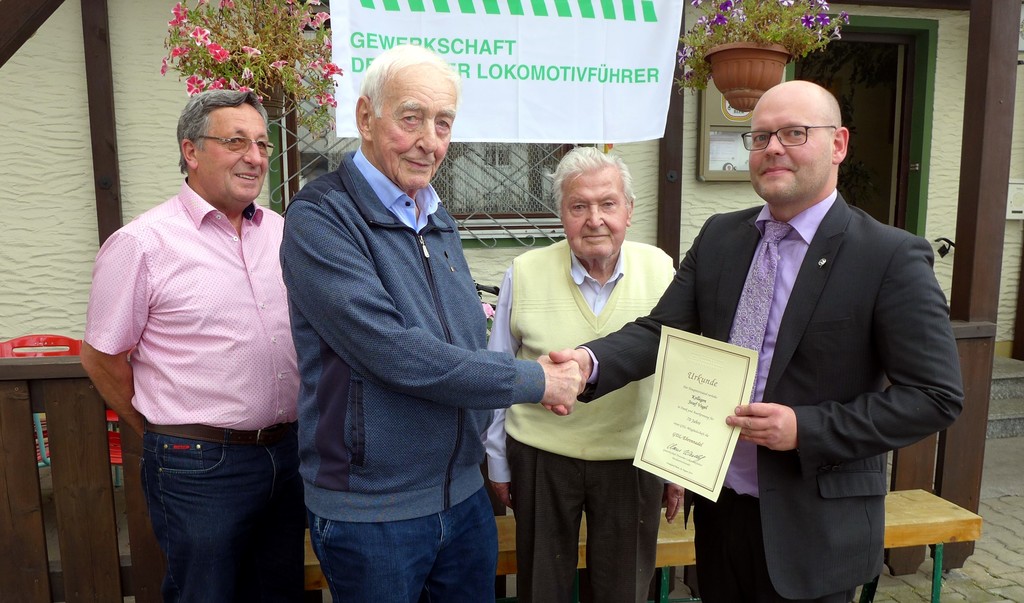 Vor 70 Jahren war Josef Vogel (96) dabei, als im ehemaligen Gasthaus Jägerhaus in Buchloe die Buchloer Orstsgruppe gegründet wurde. Als so genannter Anwärtervertreter gründete er mit seinen Kollegen 1949 die Buchloer GDL. 70 Jahre später wurde er nun vom Ortsgruppenvorsitzenden Weberschock für diese 7 Jahrzehnte Mitgliedschaft geehrt, was von großem Applaus der anwesenden Kollegen begleitet wurde.