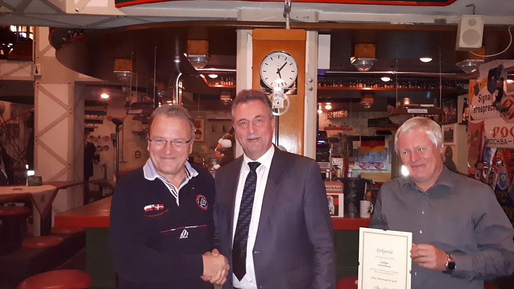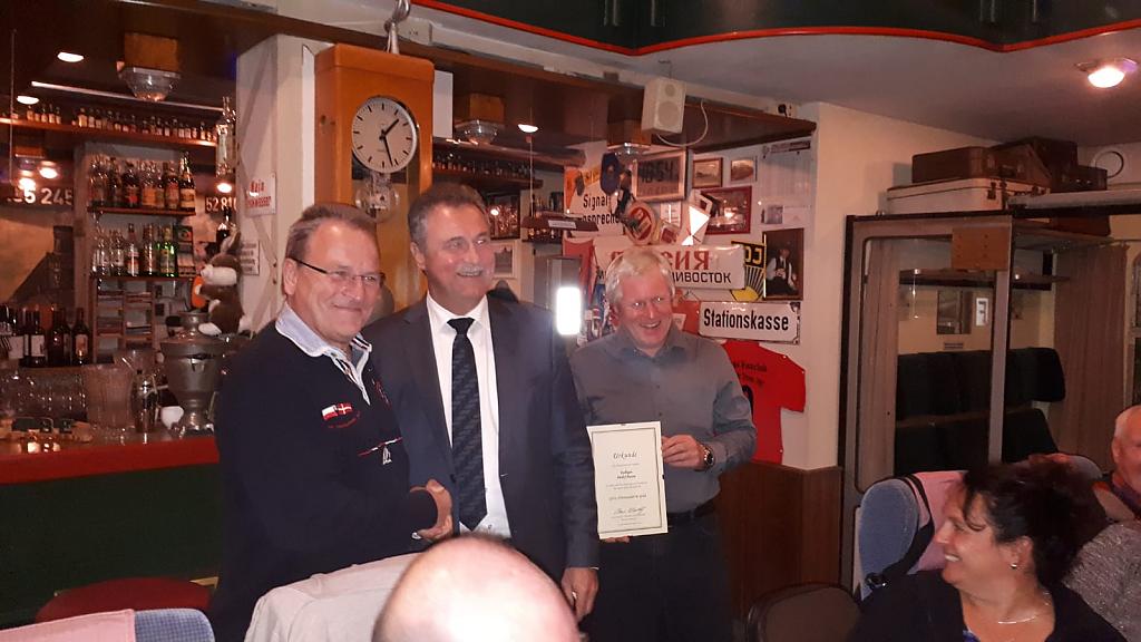 Ganz „zufällig“ tauchte an diesem Abend unser Bundesvorsitzender Claus Weselsky in der TBE auf, um Detlef Bussas mit der GDL- Ehrennadel in Gold für seine langjährigen Verdienste für unsere Gewerkschaft auszuzeichnen.