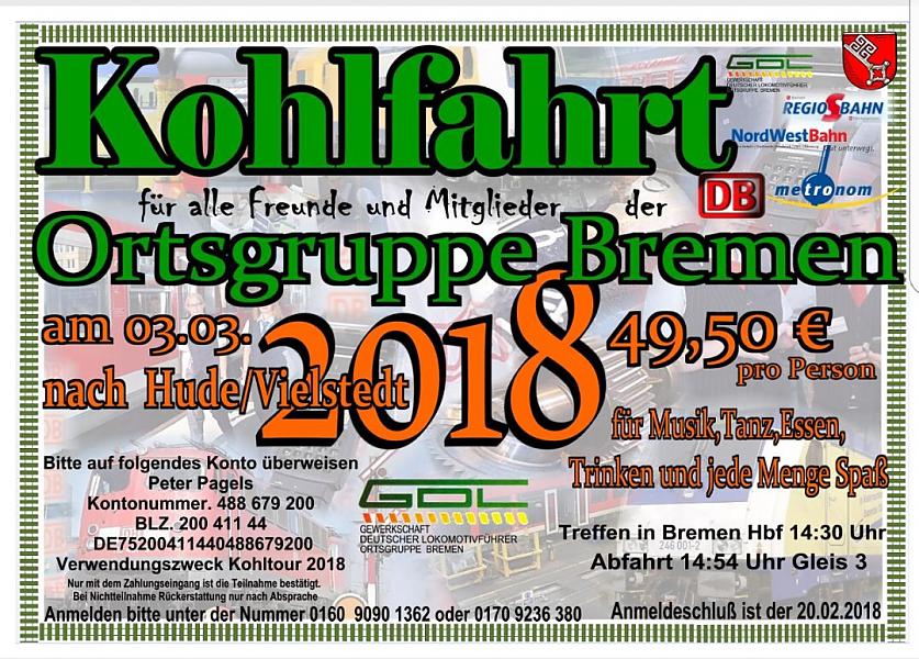 Am 03.03.2018 fanden sich 60 Kohlfreunde aus allen bereichen wie DB Cargo, DB Regio, DB Fernverkehr, Station & Service, Werkstatt, Metronom und NordWestBahn aus den verschiedenen Ortsgruppen der Region in Hude ein. Bei bester Stimmung und herlich geeigneten Wetter ging es mit dem DOSTO-Bollerwagen ins Vielstedter Bauernhaus zum geselligen Grünkohlessen.