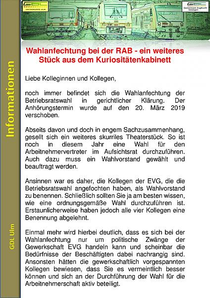 Einmal mehr wird hierbei deutlich, dass es sich bei der Wahlanfechtung nur um politische Zwänge der Gewerkschaft EVG handeln kann und scheinbar die Bedürfnisse der Beschäftigten dabei nachrangig sind. Ansonsten hätten die gewerkschaftlich vorgespannten Kollegen bewiesen, dass Sie es vermeintlich besser können und sich an der Durchführung der Wahl für die Arbeitnehmerschaft aktiv beteiligt.