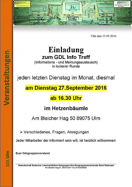 Wir laden euch recht herzlich ein, zu unserem GDL Info-Treff am Dienstag, den 27.09.2016 ab 16:30 Uhr im Hetzenbäumle (Am Bleicher Hag 50, 89075 Ulm).
