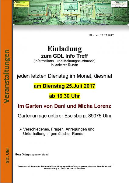 Wir laden euch recht herzlich ein, zu unserem GDL Info-Treff am Dienstag, den 25.07.2017 ab 16:30 Uhr im Garten von Dani & Micha Lorenz. (Gartenanlage unterer Eselsberg / 89075 Ulm)