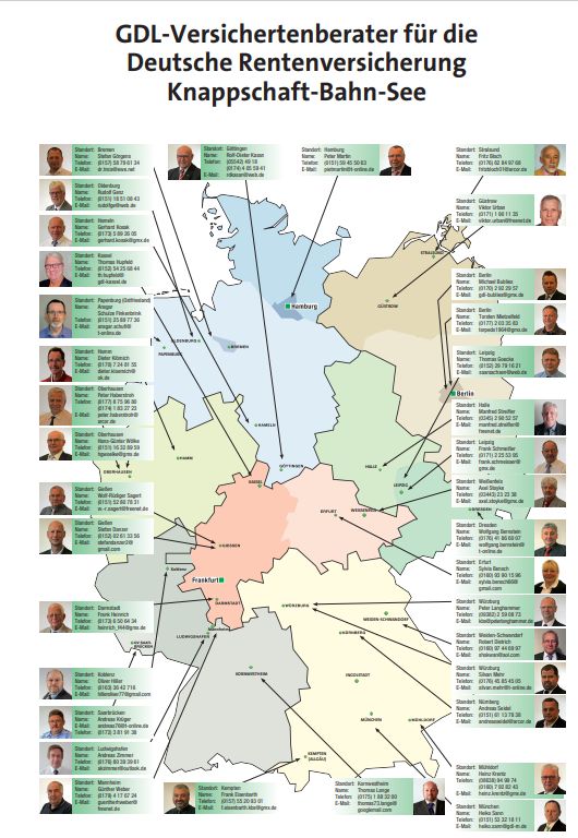 Die GDL konnte durch die Sozialwahlen im Jahr 2017 weitere Ansprechpartner in sozialrechtlichen Fragen gewinnen. Der aktualisierte Download zeigt die Versichertenberater der GDL für die Deutsche Rentenversicherung Knappschaft-Bahn-See.